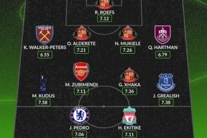 中场:库杜斯(热刺,7场1进球5助攻)、苏维门迪(阿森纳,7场2进球)、扎卡(桑德兰,7场3助攻)、格拉利什(埃弗顿,7场1进球4助攻)