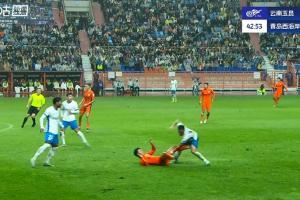 这下太痛了!第43分钟,宋浩宇防守时被倒地的罗竞踢到裆部